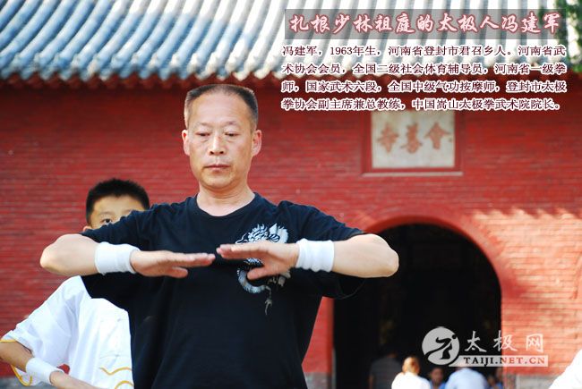 冯建军,男,汉族,1963年3月出生,河南省登封市君召乡人。河南省武术协会会员,全国二级社会体育辅导员,河南省一级拳师,国家武术六段,全国中级气功按摩师,现为登封市太极拳协会副主席兼总教练,中国嵩山太极拳武术院院长。(前年古柏掩映下的会善古寺,这里是冯建军的一个授拳点。)