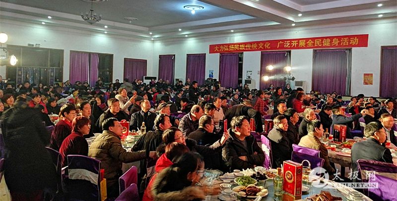 2018年12月28晚,四百余名区太极拳习练者于区政府招待所礼堂,群贤毕至,以武会友,问道竞技,辞旧迎新。陈氏、杨氏、王其和式争奇斗艳;太极拳、太极剑、功夫扇、五禽戏、八段锦异彩纷呈。