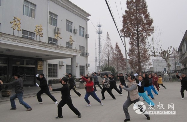 太极以其轻松柔和、疗疾健身、修性养生倍受健身爱好者喜爱。每天清晨,旌德县城梓山广场、灯光球场、人民广场、一中操场、县水务局等晨练点活跃着200余人的太极健身队伍,太极拳、太极剑、太极刀、太极扇、太极双环的精彩晨练,已成为美丽山城旌德一道亮丽的风景线。旌德太极爱好者,近日自发组织起来,成立太极拳协会,加快普及太极健身运动步伐。图为2011年12月15日清晨以机关上班族为主的旌德县水务局晨练点晨练时场景。(特约记者朱于斌)