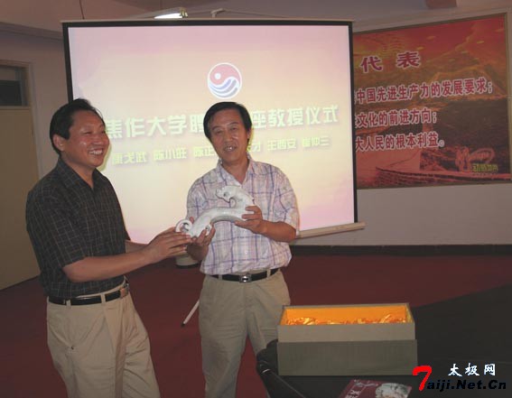 8月24日下午,焦作大学隆重集会整个校园喜气洋洋,康戈武、陈正雷、陈小旺、朱天才、王西安、崔仲三等六位武术界大师级人物被焦作大学聘为客座教授。 在聘请仪式上,焦作大学校长林效廷分别向大师们颁发了聘书和纪念品,大师们也分别向学校赠送了自己的书籍、光盘等作品。康戈武、赵功佩、霍金花等领导分别讲话,祝贺焦作大学率先开办太极拳学院,希望焦作大学努力把太极拳学院办成培养输送高素质太极拳人才的摇篮,希望大师们为太极拳事业做出更大的贡献。大师们纷纷表示,要充分利用这一平台,尽自己的努力,为太极拳事业地发展做出自己更大的贡献,为太极圣地增辉,为家乡人民添彩。 聘请仪式后,大师们应邀为学校题词,陈正雷大师挥毫题词:“太极传友谊”“太极神韵”于焦作大学,表达了对太极拳事业的发展寄予了殷切的希望。 在此以前,陈正雷大师已被国内外多家高等院校聘为客座教授;如洛阳师范学院、河南师范学院、美国加州大学尔湾分校等院校。陈正雷大师以他在太极拳方面的高深造诣,以及数十年如一日对太极拳的执着与热爱,得到了举世的尊重与认可!  受聘仪式上