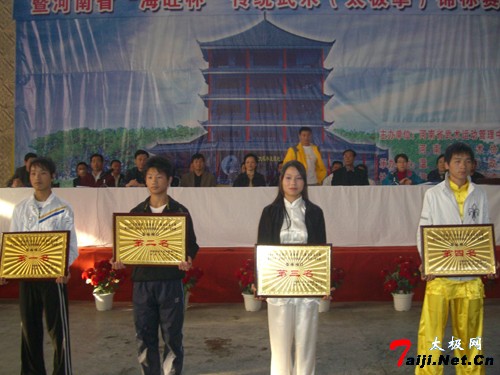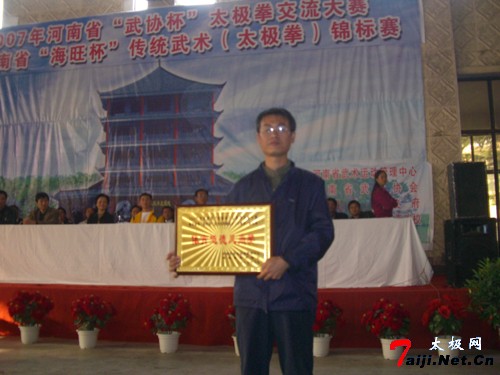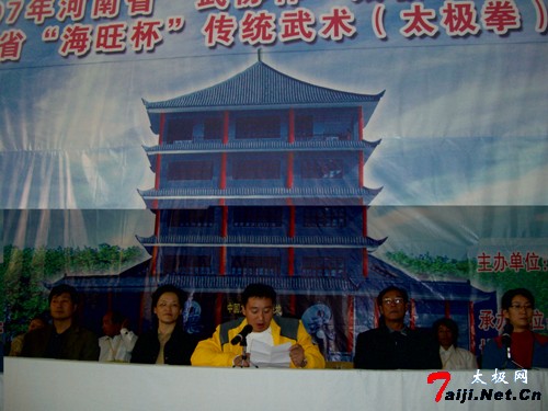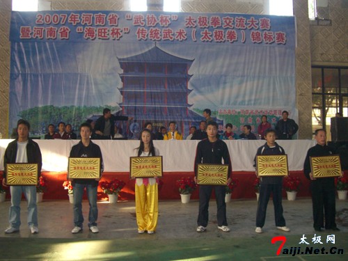 经过三天的激烈角逐,2007年河南省传统太极拳交流大赛暨“海旺杯”青少年太极拳锦标赛昨天胜利闭幕。河南省武术管理中心书记李婕、主任助理陈沛菊、温县体育局局长宋明军、太极新秀任海旺等出席了闭幕式。