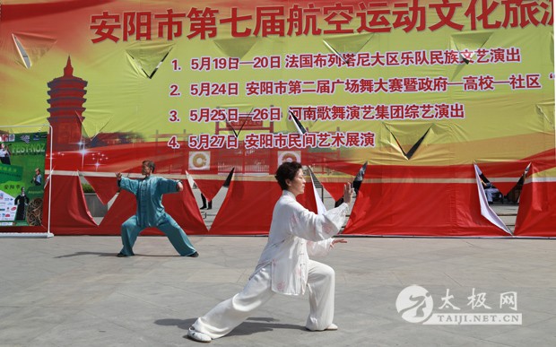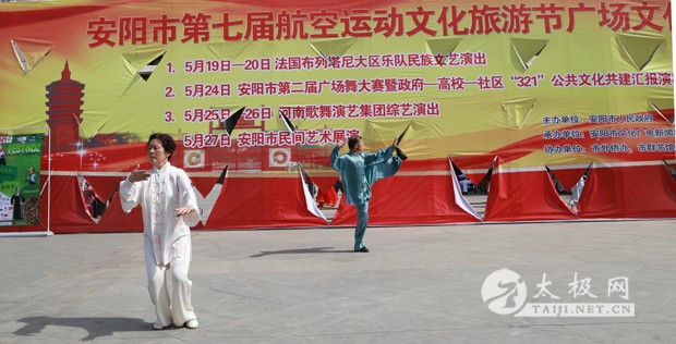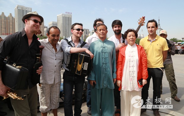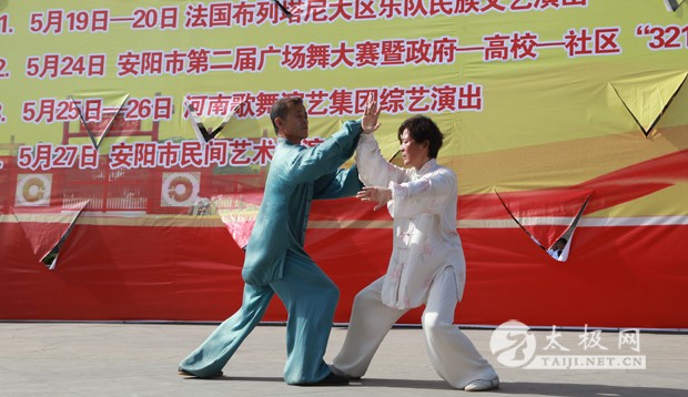 在演出现场,Ampouailh(安布艾尔)乐团为安阳人民带来了普林舞曲和布列塔尼大区中部圣尼古拉贝兰地区舞蹈等节目,并与现场市民进行亲切友好的互动。 我市著名太极拳名家史晓明、陈汉菊老师应邀为法国朋友表演了太极拳和太极推手,两位老师深厚的功力和娴熟的技艺,使法国朋友们真正感受到了太极拳形的飘逸,力的风采,健的英姿,神的韵味….