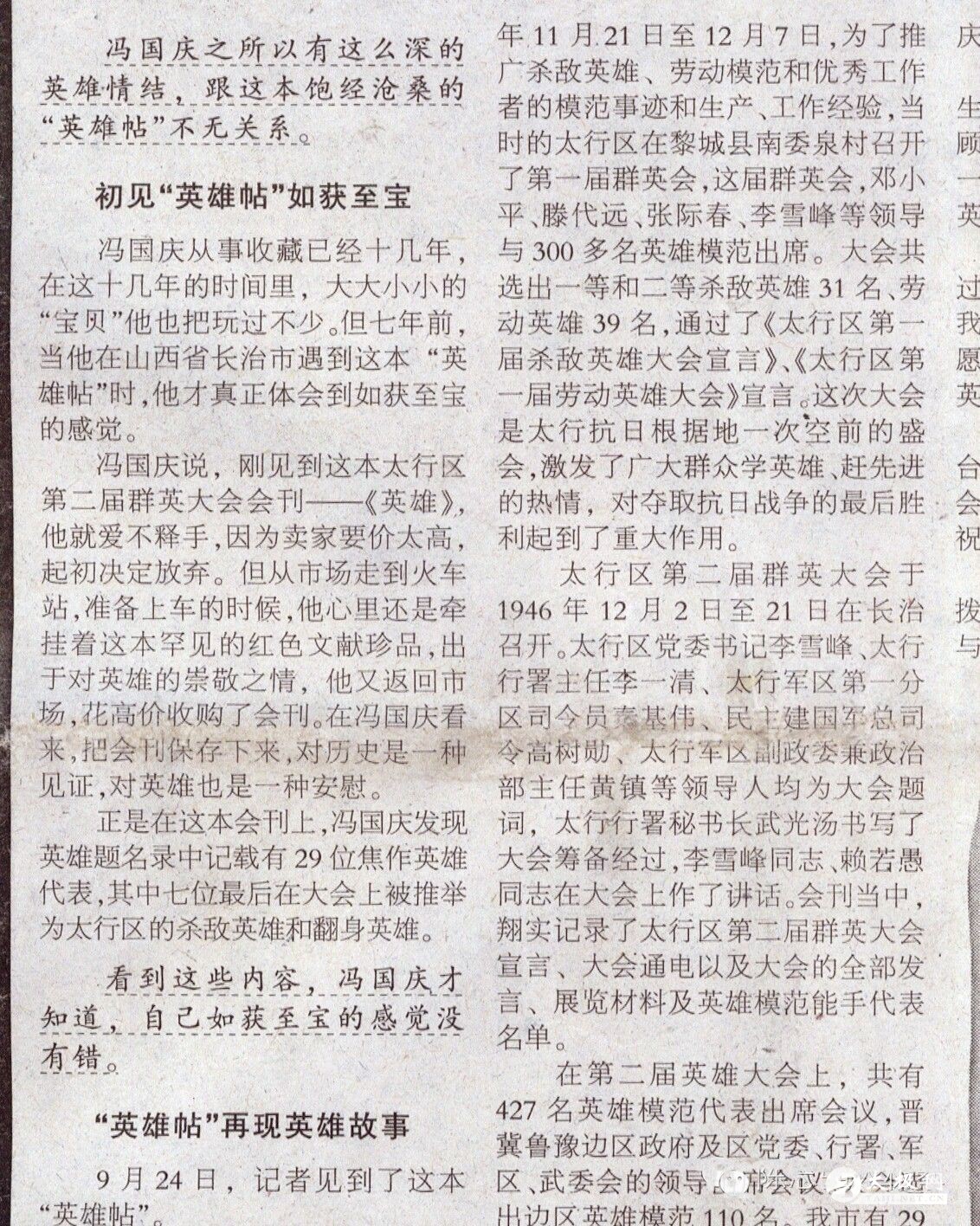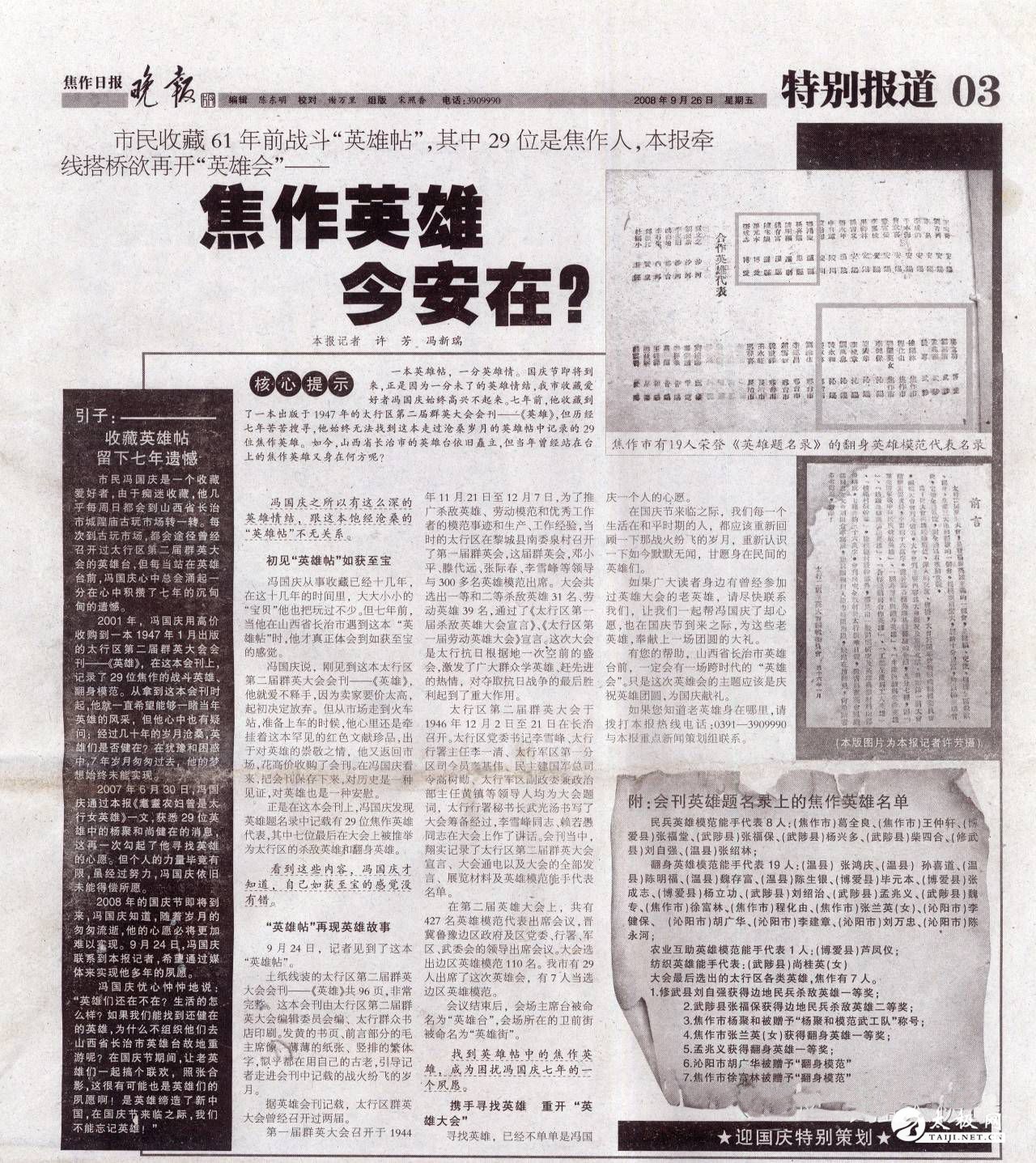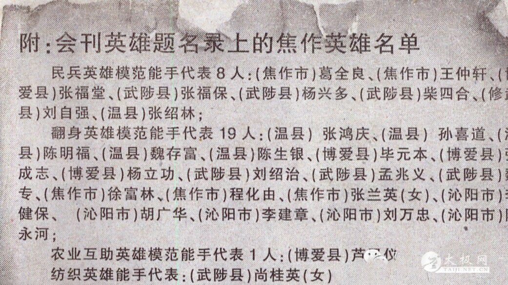 2008年9月26日,焦作晚报,第3版登载,标题为:《焦作英雄今何在》?寻找61年前战斗“英雄帖”中记录的29位焦作英雄。 1946年12月2日至21日,太行区(由晋冀豫3个省组成,管辖8个专区)第二届群英大会在长治召开。太行区党委书记李雪峰等领导和427名英雄模范代表参加本次大会,温县陈家沟陈生银作为《翻身英雄模范能手》代表出席,并荣登《英雄题名录》。 第一届群英大会是1944年11月21日至12月7日在黎城召开,邓小平等领导和300多名英雄模范出席了大会。 陈生银:太极拳发源地陈家沟第一任党支部书记