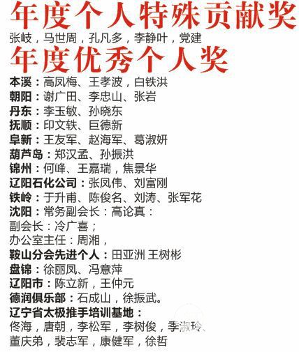 获得年度优秀个人奖的有:高凤梅(本溪)、王孝波(本溪)、谢广田(朝阳)、李忠山(朝阳)、张岩(朝阳)、李玉敏(丹东)、孙晓东(丹东)、印文轶(抚顺)、巨德新(抚顺)、孔凡多(抚顺)、王友军(阜新)、赵海军(阜新)、葛淑妍(阜新)、郑汉孟(葫芦岛)、孙振洪(葫芦岛)、何峰(锦州)、王嘉瑞(锦州)、焦景华(锦州)、张凤伟(辽化)、刘富刚(辽化)、于升甫(铁岭)、陈俊名(铁岭)、刘涛(铁岭)、张军花(铁岭)、高论真(沈阳)、冷广喜(沈阳)、周湘(沈阳)、田亚洲(鞍山)、王树彬(鞍山)、徐丽凤(盘锦)、冯意萍(盘锦)、陈立新(辽阳)、王仲元(辽阳)、石成山(德润)、徐振武(德润)、佟海(基地)、唐朝(基地)、李松军(基地)、李树俊(基地)、季淑玲(基地)、童庆弟(基地)、裴志军(基地)、康健军(基地)、徐哲(基地)。 通讯:辽宁省太极推手研究会副会长张岐 本站编辑:太极网陈超 |
