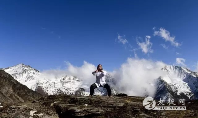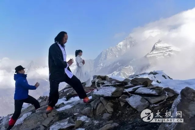 刘滨、古亚鹏、赵迎纷纷拿出架势,站立如松。在四姑娘山大峰5025米的云端,青城太极打出世界“最高”的起势,那一瞬间的庄严和动人,令周围观者瞬间静默。