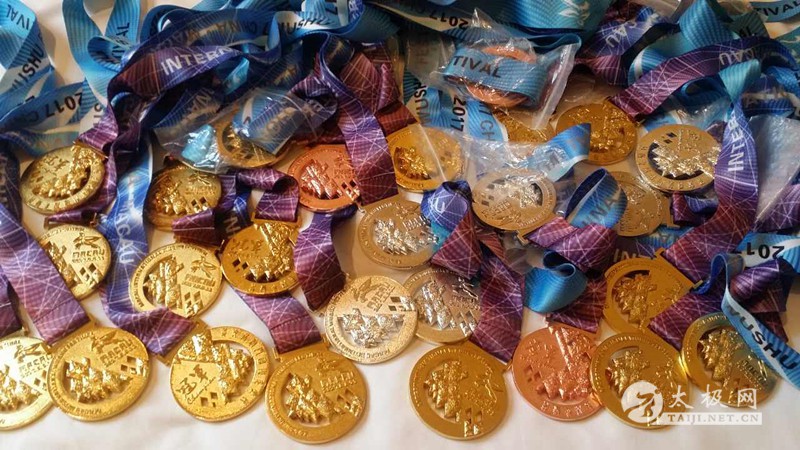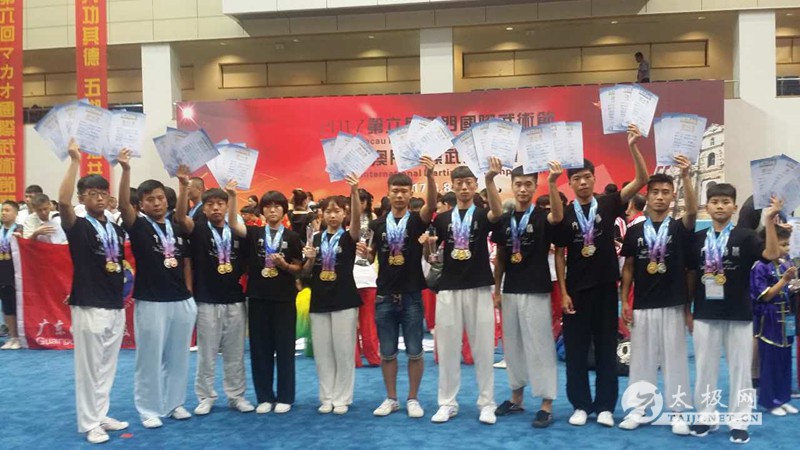 (太极网报道)近日,温县有刚太极武校在校长陈有刚的带领下,组织十一名太极健儿参加2017第六届澳门国际武术节暨澳门国际武道大赛。健儿们在赛场上努力拼搏,共获得奖牌28枚,金牌18枚、银牌8枚、铜牌2枚,斩获一个第四名,三个第五名和一个第六名,同时斩获推手冠军9人、亚军2人的优异成绩,并获集体推手奖团体第一名!获团体金奖!