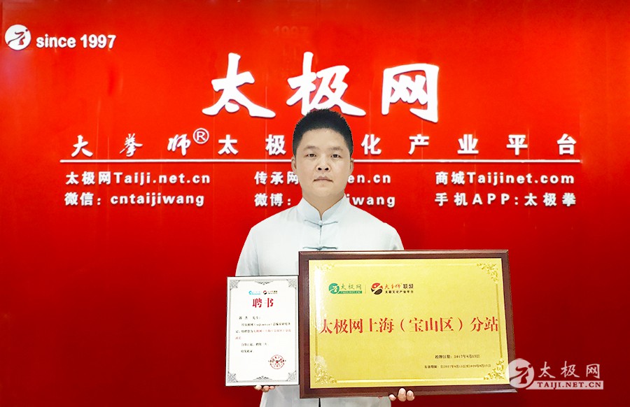 (太极网上海宝山讯)8月15日,太极网(taiji.net.cn)上海(宝山区)分站正式挂牌成立,上海星太极养生文化馆馆长郭杰任分站站长。 郭杰在接受太极网上海(宝山区)分站站长聘任时表示,感谢太极网二十年来为太极拳传播做作出的贡献,更加感谢太极网对自己的信任,此次出任上海(宝山区)分站站长,自己将会以更加严格的标准来要求自己,同时继续加强太极拳的学习,无论是拳技拳法还是理论都需要比以前更加深入的了解。上海(宝山区)分站的建立也将进一步推进上海(宝山区)及其周边地区的太极拳的推广和传播工作。郭杰表示自己将会带领太极网上海(宝山区)分站为太极拳传承人、拳师、拳馆服务,致力于打造一个让广大太极拳爱好者互通有无、相互交流、共同进步的平台,共同为弘扬太极拳、传播太极文化不懈努力!