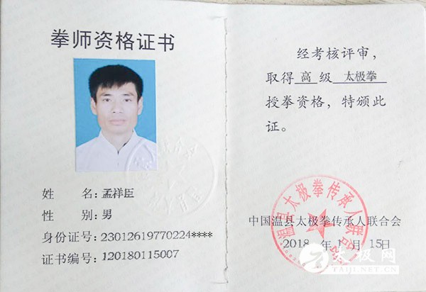 太极拳拳师资格证,是拳师授拳资格、技术水平的证明。经专家评审委员会评审,孟祥臣精通太极拳套路、器械教学,深入了解太极拳拳理拳法,并具备独立完成太极拳教学任务的能力,参加过国际国内及省级(含省级)以上太极拳赛事,取得优异成绩,特颁发《高级拳师资格证书》。 孟祥臣,1977年出生,哈尔滨市呼兰区人。1995年跟随陈庆州宗师学习尊古太极拳、推手、散手。后又从师于陈正雷学习太极拳、械、理论知识等。陈式太极拳第十二代正宗传人,非物质太极拳文化遗产传承人,现为呼兰区武术协会总教练;呼兰区祥臣武校校长兼总教练;哈尔滨市“尊古陈式太极拳”主教练;呼兰区传授陈式太极拳“第一人”;呼兰区东方红小学武术总教练;中国武术段位制六段;国家一级裁判员;国家一级社会指导员;中国武术协会会员;哈尔滨市政协委员;呼兰区政协委员,哈尔滨市“百名健身使者”称号。 1999—2017年参加比赛,在市级、省级、国际级比赛荣获多次金奖冠军。2017年7月21日,在马来西亚国际武术节比赛荣获金奖,武术名师称号。9月4日在哈尔滨市呼兰区东方红小学举办:世界百城千万人太极拳展演活动,1200人参加太极拳表演活动。9月20日参加香港政府举办的“华夏枫叶红”庆祝建国68周年大型文艺汇演,荣获陈式太极拳金奖。 1999年任温县庆州武院教练。2002年在哈尔滨市呼兰区传授陈氏太极拳,2004年开办祥臣武校担任校长兼总教练。2003—2017年担任呼兰区东方红小学武术教练、萧红小学武术教练、建国小学武术教练、呼兰区武术协会副会长兼总教练。 责任编辑:太极网小田 |