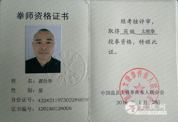 蒋仕华,1973年出生于湖南常德市鼎城区草坪镇放羊坪村,自幼喜爱习武,2012年开始习练陈式太极拳、械、推手及内功。 2015年正式拜陈家沟太极拳传人——孟凡为师。后多次参加广东省深圳市武术比赛,荣获多次太极拳、械、推手金奖。并多次在大型活动中应邀表演。还兼任多家太极拳社会组织团体顾问、理事等职。希望将太极拳发扬光大!宏扬太极精神! |
