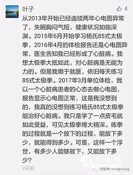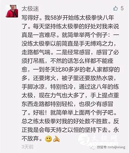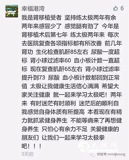 太极拳的历史非常悠久,堪称中国传统武术的代表,主要因为练太极拳的好处非常多,已经成为一种“健身符号”,强身健体、益寿延年是其发展的主旋律。 据不完全统计,包括中国在内,全球150多个国家和地区练习太极拳者已近3亿人。 每个时代都有很多人热衷于太极…… 当我们开始练太极,往往是我们身体状况欠佳或者心里状态不好的时候。 当我们忘记练太极,往往是我们工作生活的忙碌或者健康状况尚好的时候。 太极本身并不神奇,她不会让我们立即变得强壮,立即调整好心态重新面对生活的压力。 但是持续练太极的状态却是神奇的,这样的状态会让个人身心健康产生时间复利的效应。 一个人能坚持练太极,不仅仅说明他对太极的热爱,更能说明他对未来美好生活的向往,说明他对自己和家庭有一份责任心。这样积极乐观的心态,会让他每一天都充满阳关,充满希望。每天修炼水平提升一点点,最终成为更好的自己。 太极是一种生活状态。 神奇的化学反应由此开始。 。 。 。 关于太极的故事还有很多很多 看完大家的分享 可能 有人懊悔 有人窃喜 有人憧憬 …… 在这个飞速发展的时代 不妨放慢您的脚步 让太极为您的健康 保驾护航 因为 健康 才是人生的第一财富 健康 是幸福生活的第一步 没了健康 什么都是浮云 |