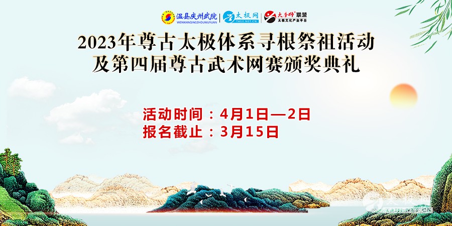 清明节是传统的重大春祭节日,扫墓祭祀、缅怀祖先,是中华民族自古以来的优良传统,不仅有利于弘扬孝道亲情、唤醒同门共同记忆,还可促进体系成员乃至民族的凝聚力和认同感。 大疫三年,阻断了人们的交往,但未损尊古同门的情谊丝毫。为了增强本体系的凝聚力、认同感。经尊古太极体系理事会研究决定,兹定于2023年4月1日—2日,举办2023年尊古太极体系寻根祭祖及第四届尊古武术网赛颁奖典礼活动。诚邀尊古太极体系门下成员积极报名参加,报名截止日期2023年3月15日,具体日程安排如下: 李 宁:17796685993(微信同号) 尊古太极体系理事会 2023年3月3日 |