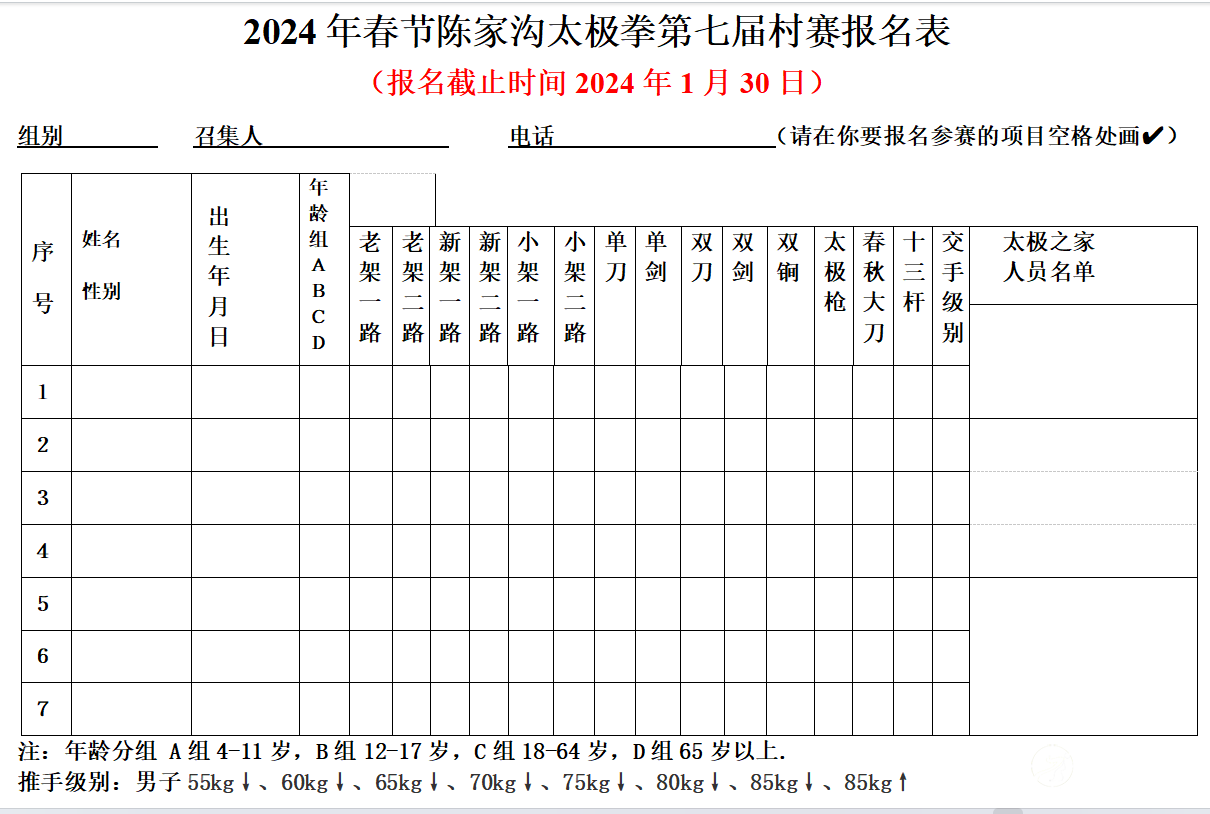 2024年春节陈家沟太极拳 “大咖国际”第七届村赛活动方案 一、赛事宣言 保持陈家沟太极拳的长盛不衰、延续村中世代习武风尚、守护太极拳发源地根脉,促进拳师间的交流团结、扩大村民习拳群体,夯实全村习拳基础,激发全村以习拳会拳为荣耀,发现和培养更多的优秀太极拳专业人才,带动周边村镇的太极拳文化活动,引领太极拳发展的时代潮流。 二、赛事介绍 本赛事由陈家沟村民委员会主办,陈家沟太极拳协会、陈家沟陈氏家族理事会承办,每年春节期间举行。参赛人员为陈家沟、陈新庄、辛堂、留村以及外迁的陈家沟原居民,活动支持方为陈家沟及周边诸多太极拳拳师以及各地的陈氏太极拳子弟。 赛事活动第一项为大年初一上午10:00在祖祠广场的半小时太极拳演练,将太极拳展演活动列为陈家沟初一祭祖仪式的首要内容。赛事活动的第二项为太极拳交流比赛,时间定为初三至初六每天下午14:00点开始。 本赛事自2016年春节起,将每年春节期间举办,生生不息、代代相传,成为陈家沟太极拳文化不断发展的象征和检验平台。 三、赛事组织 1、大赛名誉主席:陈小旺 陈正雷 王西安 朱天才 陈伯祥 陈全忠 陈沛林 2、大赛主席:陈小星 副主席:陈沛菊 3、大赛总指导:陈冲 4、大赛副总指导:陈自强 5、大赛顾问 (村内)陈天成、陈清环、陈立洲、陈保华、陈喜法、陈东海、陈东山、张永国、陈立法、陈全旺、陈为民、陈向乡、陈向红、陈向前、陈坤、李如意、陈迎军、陈鹏飞、陈三虎、陈万波、陈福旺、朱保林、朱向前、朱向怡、陈绍雷、陈恩、陈娟、陈琦、陈吉、陈小六、陈根全、 陈有利 、陈红 、吴战江 、李斌、 陈皂罗、谢蓓蕾、陈梦芝、陈艳、陈六有、陈启亮、陈启雷、翟全平、陈桂生、陈春生(西安)、陈淑丽、陈荣利、陈国胜、陈国庆、陈西鹏、陈西立(西安)、陈泽峰、陈晓剑(太原)、陈金生(西安)、陈秋菊、刘根齐、朱飞飞、李芳、王福礼、王虎、张福才、雒孬、黄满堂、王翠花、郑迪、郭西林、张保忠、陈战强、陈小根、原大伟、程伟、陈海军、王会战、陈长江、王向忠...(周边)王永、陈文革、陈建军、陈梅、陈根成、陈庆雷、张随胜、张涛、陈进才、曹二柱、陈小保、王东红、陈凤云、李立军、... 6、大赛组委会 陈军团 陈霞 陈志强 陈军营 陈军 陈自军 陈斌(10队) 陈媛媛 王战东 王战军 陈冲(5队) 朱向华 陈卫生 陈一华 陈绍杰 张福旺 陈二虎 朱学峰 陈冲(8队)陈铁柱 吴占涛 陈全胜 陈炳 组委会职责:负责大会工作的全面落实、把握赛事发展方向、筹备赛事资金、调配赛事人员及组织大会会议和确定工作方案。 7、大赛裁判及保障组 陈长军、陈向武、陈大虎、陈冠军、陈长峰、陈有雷、段卫星、陈金堂、陈德鹏、陈占成、张恒义、陈涛、陈庆源、陈国强、陈国太、陈绍冲、陈绍杰、陈建强、陈齐、陈硕、陈相林、陈大伟、陈朝霞、武小敏、陈鹏、张绍刚、李建中、吴战江、李民、冉永庆、王利娟、张绍东、王战国、王战营、吴淼、王全中、贺卫军、李相东、董芮希、郑赢全、侯永超、陈铮、陈志峰、申典雅、陈小栋、陈鑫、王海军、朱佳楠、陈辉、朱蒙蒙、陈腾超、陈建翔、王金、陈天庆、陈勇安、2队陈斌、朱向峰、陈志伟、陈新芳、陈爱群、陈国杰、陈迎喜、陈保林、陈沛杰、陈建民、陈方贤、陈向前、陈小群、陈亚军、陈庆云、陈麦香、陈雪飞、辛强、朱堡垒、陈飞鸿、陈超、陈巍、陈飞、陈永峰、王朝、陈斌(西安)、陈三根、陈焦生、宋志旭、陈庆、陈庆毅、陈杰、陈天森、陈天超、陈天视、王长宾、王大娟、王二娟、任明明、陈向坤、陈苏娟、陈跃、王帅、刘重阳、刘新新、陈俞良、张凤义、陈二伟、王苗、陈永昌、陈永浩、陈序、申绍杰、陈龙飞、陈腾飞、张沛娟、陈永波、吴飞、钦祥云、翟跃沛...... 裁判组职责:负责报名统计、赛程编排、秩序册编印、赛场布置、裁判安排和场上执裁。 保障组职责:全面协助赛场工作、维护和监管赛场秩序、根据大赛需要,随时到岗。 8、大会仲裁组:陈长流 陈照森 陈俊岭 陈素英 陈桂珍 陈春爱 陈瑞华 陈春生 陈庆雷 仲裁组职责:现场督导裁判工作、对比赛规则进行研究和完善。 9、大会财务组:王亚茹 陈霞 陈涛 财务组职责:严格管理好筹款的收支使用,保证账目清晰透明,接受财务监管组的核对。对大会购买的物资登记造册并妥善保管 。 因掌握信息有限,向未列入大赛名单者致歉,并请未列入者联系组委会13323895769陈炳,进行补录登记。 10、财务监管组: 安三旺 陈一华 陈 冲(村委) 财务监管组职责:对大会财务收支情况给予监督和张榜公布,发布筹款使用状况的监管评语。 四、赛事内容 1、陈氏太极拳老架一路(听裁判6分钟鸣哨截止,套路可节选) 2、陈氏太极拳老架二路(听裁判3分钟鸣哨截止,套路可节选) 3、陈氏太极拳小架一路(听裁判6分钟鸣哨截止,套路可节选) 4、陈氏太极拳小架二路(听裁判3分钟鸣哨截止,套路可节选) 5、陈氏太极拳新架一路(听裁判6分钟鸣哨截止,套路可节选) 6、陈氏太极拳新架二路(听裁判3分钟鸣哨截止,套路可节选) 7、陈氏太极单剑(全套完成或4分钟鸣哨停止) 8、陈氏太极单刀(全套完成或1分钟鸣哨停止) 9、陈氏太极枪(全套完成或3分钟鸣哨停止) 10、陈氏太极春秋大刀(全套完成或3分钟鸣哨停止) 11、陈氏太极十三杆(全套完