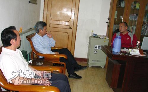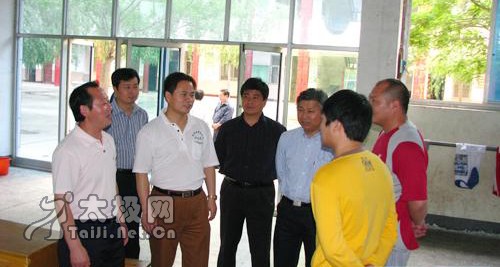 应温县体育局局长宋明军之邀,西安体育学院武术系主任陈亚斌在陕西省武术运动管理中心社会部部长肖关纪、陕西省武术协会副秘书长吴颖锋的陪同下,5月9日莅临武术之乡——河南省温县考察武术生源状况。 温县是全国首批武术之乡,太极拳发源地,习武人数众多,太极拳优秀人才出路问题,一直是制约太极拳人才发展的瓶颈。今年以来,温县体育局通过牵线搭桥,相继和河南大学体育学院、洛阳师范学院达成协议,为高校输送优秀武术人才建立了培训基地。温县体育局局长宋明军、武术科科长王东方、陈家沟太极拳推广中心执行主任陈皂罗、副主任张福旺、王战军、和式太极名家和有禄等陪同客人考察陈家沟武术院,并观看了陈家沟武术院学生太极拳套路、器械及推手表演。 陈家沟武术院执行院长王战军向陈亚斌主任、肖关纪部长介绍学校概况 在陈家沟武术院观看太极拳表演(左起):陈皂罗、吴颖锋、肖关纪、陈亚斌、宋明军、王战军 与曾在陕西省散打队进修的樊帅鑫交流
