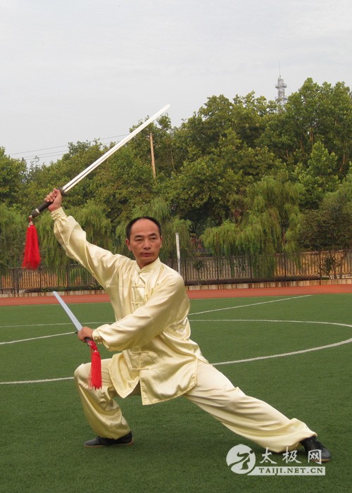 说明:刀谱采自陈主清著《陈氏太极拳小架》、陈沛菊“陈氏太极小架”网站。 1930年至l938年,著名太极拳师、陈氏十八世陈照丕在南京授拳时,在十三刀的基础上,增加了9个动作(单刀起势、护心刀、左拨草寻蛇、右拨草寻蛇、青龙出水、风卷残花、雁别金翅、夜叉探海、左右翻身砍,形成了现在流行的陈氏太极单刀套路22势,陈氏太极拳大架系多习练之。 太极双刀(34势) 陈氏太极双刀是陈氏太极功夫器械套路中双兵器的一种。几百年来,34势双刀在陈家沟广为流传,是最古老的双器械套路之一。套路布局合理,衔接紧凑,刀法清晰,用法逼真。它以劈、砍、撩、挂、扎、截、拦、压、推、抹、横、架及舞花等刀法,结合陈氏太极拳舒展大方的身法,灵活稳健的步法,将陈氏太极拳刚柔相济、快慢相间、松活弹抖的特点表现得淋漓尽致。 双刀套路练习,要求身法协调一致,刀法步法密切配合,“单刀看手,双刀看走”之说,强调了练习双刀时步法的重要性。双刀有刀如流水、步法如飞、缠头裹脑、快速有力、气势磅礴、刚柔相济的风格。 太极双刀(34势)动作名称:全舞花朝阳、切三刀、一刀跃步、雁别金翅、上三刀、孤雁出群、一刀朝阳、左插花、右插花、二刀朝阳、两刀蝴蝶戏水、一刀朝阳、左插花、右插花、二刀朝阳、二刀伏虎、一刀朝阳、钟馗仗剑、古树盘根、翻身砍、一刀朝阳、左搅龙、右搅龙、二刀朝阳、二刀转向、霸王举鼎、罗汉降龙、左右片刀、二刀朝阳、白蛇吐信、左右扑刀、上步七星、下步跨虎、一刀下势。 说明:①刀谱采自陈家沟太极拳学校武术教研室教材。②陈正雷著《陈氏太极拳械汇宗》为55势,他增加了双刀起势和双刀收势二势,将22势左搅龙和25势右搅龙合为左右搅龙一势。 另外,陈家沟还广为流传太极双刀(2 4势),太极拳小架系多习练之 太极单剑(49势) 陈氏太极单剑,是太极功夫套路中短器械的一种,也是最古老的器械套路之一。套路布局合理,衔接紧凑,剑法清晰,以刺、劈、撩、挂、点、抹、托、架、扫、截、扎、推、化等剑法,并结合太极拳舒展大方的身法,灵活稳健的步法,忽刚忽柔,忽隐忽现,沾粘连随、腾闪折空的变化,真正体现出陈氏太极剑以身运剑,连绵不断,缠绕回旋,蓄发相变,刚柔相济,快慢相间的特点,以及沾粘不散,无孔不入,虚笼诈诱,变化莫测,屈伸往来,刚劲有力的技击技法。以意导气,以气催身,劲贯剑梢,周身一致,圆转自然。拳谚云:“练刀洳猛虎,练剑如游龙。”故在练剑时如同练拳一样,运动如行云流水,连绵不断,浑厚圆转,发劲如金狮抖毛,瞬息万变。 太极单剑(49势)动作名称:单剑起势、朝阳剑、仙人指路、青龙出水、护膝剑、闭门势、青龙出水、翻身下劈剑、青龙转身、斜飞势、展翅点头、拔草寻蛇、金鸡独立、仙人指路、盖拦势、古树盘根、饿虎扑食、青龙摆尾、倒卷肱、野马跳涧、白蛇吐信、乌龙摆尾、钟馗仗剑、罗汉降龙、黑熊翻背、燕子啄泥、白蛇吐信、斜飞势、鹰熊斗智、燕子啄泥、摘星换斗、海底捞月、仙人指路、凤凰点头、燕子啄泥、白蛇吐信、斜飞势、左托千斤、右托千斤、燕子啄泥、白猿献果、落花势、上下斜刺、斜飞势、哪吒探海、怪蟒翻身、韦驮献杵、磨盘剑、单剑收势。 陈式太极单剑 说明:①剑谱采自陈小旺《中国陈氏太极拳》、陈正雷《陈氏太极拳械汇宗》、陈正雷首尾两势叫太极剑初势、太极剑还原。②陈家沟太极拳学校武术教研室教材无起势、收势二势,其将展翅点头分为凤凰展翅和风凰点头二势;上下斜刺分为上斜刺和下斜刺二势。③陈立清《陈氏太极拳小架》、陈沛菊陈氏太极小架网站均为48势,都没有起、收二势,招式名称大同小异,但顺序差异较大。太极双剑(39势) 太极双剑是太极功夫器械套路中双兵器的一种,套路中有各种刺、点、撩、挂等剑法,配合太极缠丝劲,动作灵活多变,腕力突出。 太极双剑 太极双剑(39势)动作名称:落花流水朝阳剑、转身美女望月、夜叉探海、黑熊翻背朝阳剑、转身凤凰双展翅、上三剑、古树盘根、曰套三环、黑熊翻背朝阳剑、左罗汉降龙、右罗汉降龙、转身蝴蝶戏水、黑熊翻背朝阳剑、左罗汉降龙、右罗汉降龙、二郎担山、黑熊翻背朝阳剑、钟馗仗剑、古树盘根、翻身下劈、黑熊翻背朝阳剑、左翻身下劈、右翻身下劈、左罗汉降龙、翻身朝阳剑、霸王举鼎、护膝剑、白蛇吐信、左凤凰双展翅、右凤凰双展翅、转身朝阳剑、连环刺虎、左右双手剑、左盘龙、右卧虎、狮子滚绣球、美女纫针、拨云望日、怀中抱月。 说明:①剑谱采自陈立清《陈氏太极拳小架》、陈沛菊“陈氏太极小架”网站。 ②陈正雷《陈氏太极拳械汇宗》多“双剑起势”和“左右磨盘剑”二势;无“美女纫针”一势,少“左罗汉降龙”一势。其中间顺序略有差异。 |