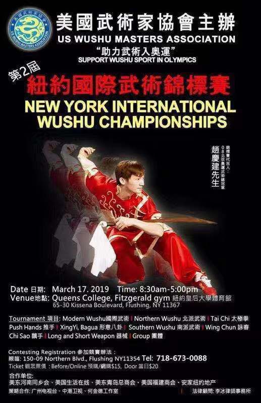 仲春纽约,冰雪融化,阳光明媚,碧空万里,第二届美国纽约国际武术锦标赛于17日在美国纽约皇后大学体育馆隆重举行,主办方美国武术家协会,特邀了2008北京奥运武术全能冠军赵庆建担任了大赛形象代言人,“助力武术入奥运”为大赛的口号,这是一代代中华武术人的共同奥运梦想。