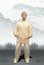 起势:练功先练腿,左脚开立,与肩同宽,微微下蹲,两掌呈半圆抱于腹前;